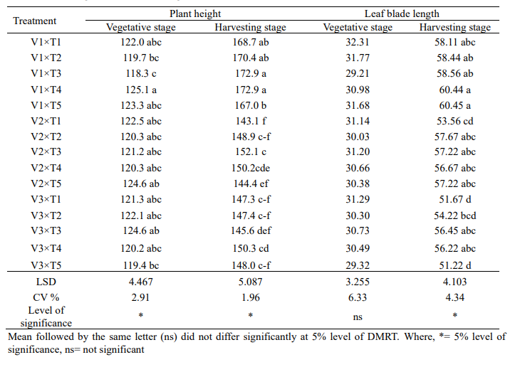 Result showed that the ltively. The lowest plant height (143.1 cm) was recorded in V2×T1. The plant height of V1 was more taller than V2 followed by V3 plants. The shorter plant is an important desirable index for lodging reaf blade length was insignificant at their vegetative stage but harvesting stage. The leaf blade length of three aromatic rice cultivars at harvesting stage was influenced by the application of 6-BAP which have been presented in Table 1. The longest leaf blade (60.45 cm) was observed in V1×T5 which was at par with V1×T4 (60.44 cm) while the shortest leaf blade (51.22 cm) was 51.22 cm in (V3×T5) which was also statistically identical with V3×T1 (51.67 cm).