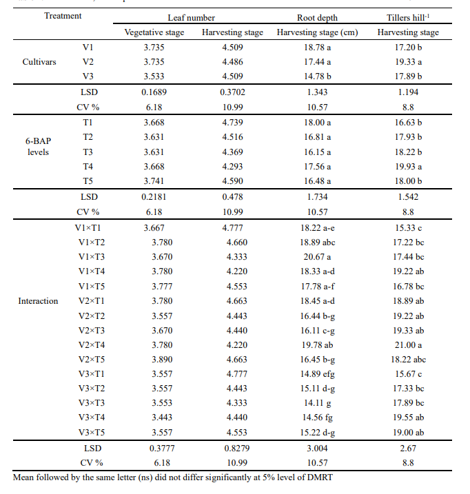 Table 2. Leaf number, root depth and tiller number of three aromatic rice cultivars under different levels of 6-BAP