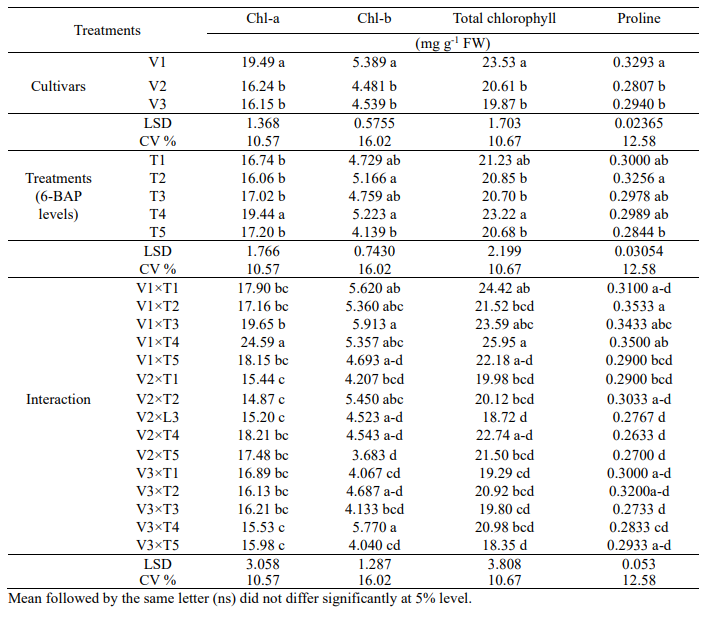 Table 3. Chlorophyll and proline content of flag leaf of three aromatic rice cultivars under different levels of 6-BAP