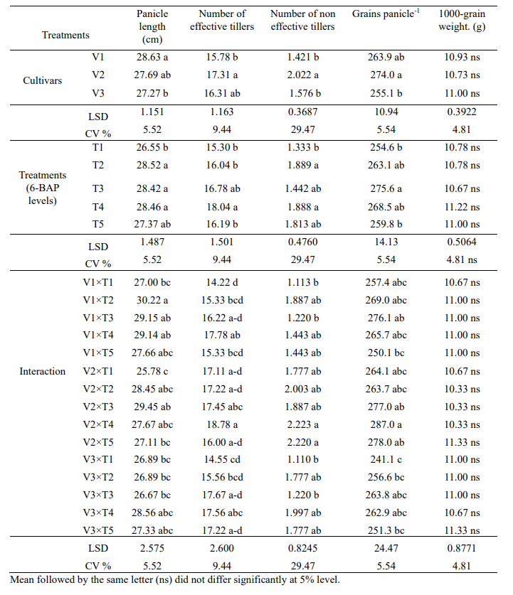 Table 4. Effect of cultivar, 6-BAP levels and their interaction on yield contributing characters of aromatic rice.