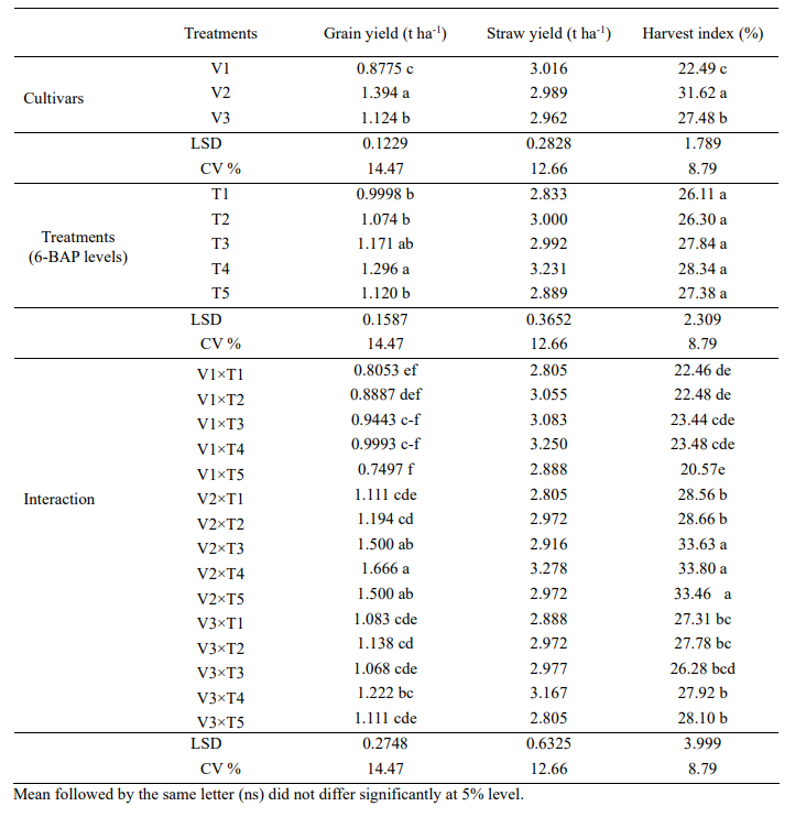 Straw yield: There is no significant effect of BAP on straw yield of the aromatic rice cultivars (Table 3). Several authors found that there was no positive effect of BAP (Roxy 2016) and NAA (Rahman et al. 2017) application on straw yield of different rice cultivars.